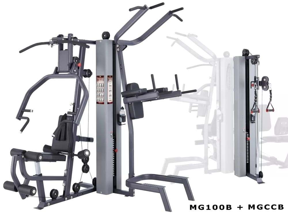 Die MG100B Maschine vereint die Trainingsfunktionen von Brustpressen, Latzügen und Beinstreckern als Basiseinheit und verfügt außerdem über eine bereits im Lieferumfang enthaltene duale Kabelzugstation mit höhenverstellbaren Zugschlitten sowie einer Station für Klimmzüge und Bauchmuskelübungen. Unabhängig vom Fitness-Level können Einsteiger sowie Fortgeschrittene praktisch alle wichtigen Muskelgruppen effektiv und zielorientiert trainieren. Die beiden Trainingsarme mit einer klassischen langen Zugstange als Zubehör erweitern die Trainingsmöglichkeiten und passen sich den Bedürfnissen verschiedener Sportler an. Der Drückerbügel verfügt zudem über 4 unterschiedliche Einstellmöglichkeiten sowie Multipositionsgriffe, die die Muskelkontraktion bei Brust-, Schrägbank- und Schulterübungen noch weiter erhöht. Dank der beiden 95kg-Steckgewichtsblöcke können zwei Personen gleichzeitig trainieren, sodass sogar ein intensives Partnertraining ermöglicht wird. Kugelgelagerte Umlenkrollen sowie ein nylonbeschichtetes Stahlseil aus dem Flugzeugbau reduzieren dabei die Reibungskräfte auf ein Minimum und gewährleisten dadurch ein friktionsfreies Training mit konstanter Zugspannung.