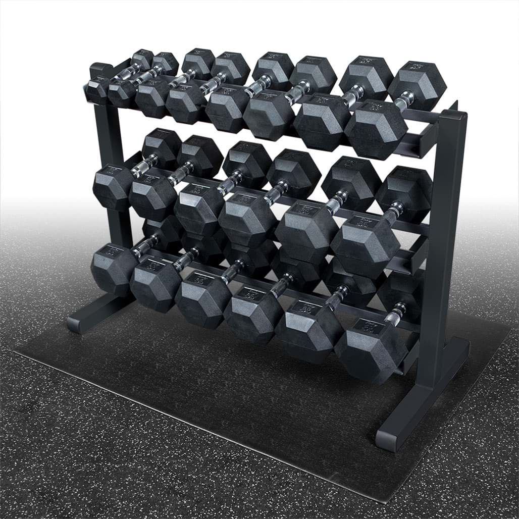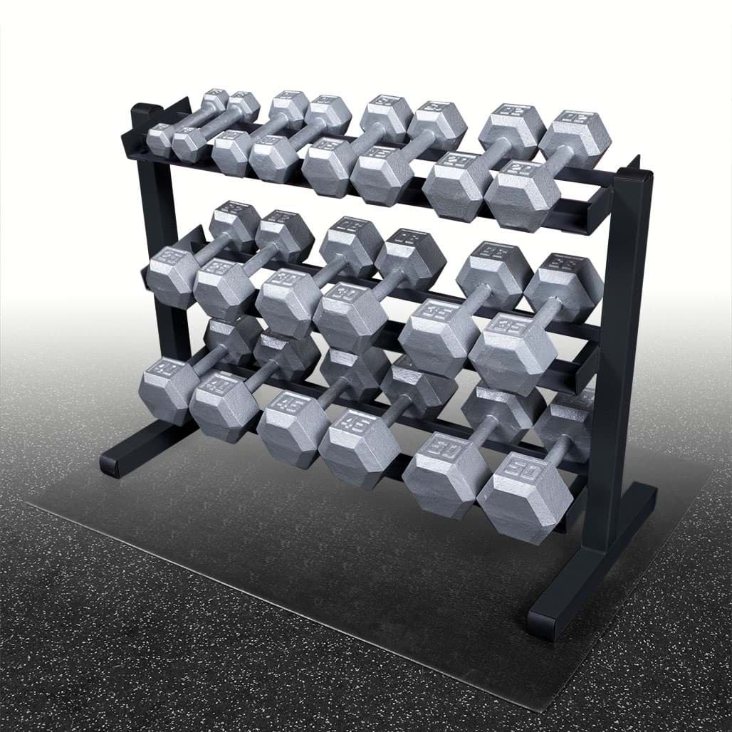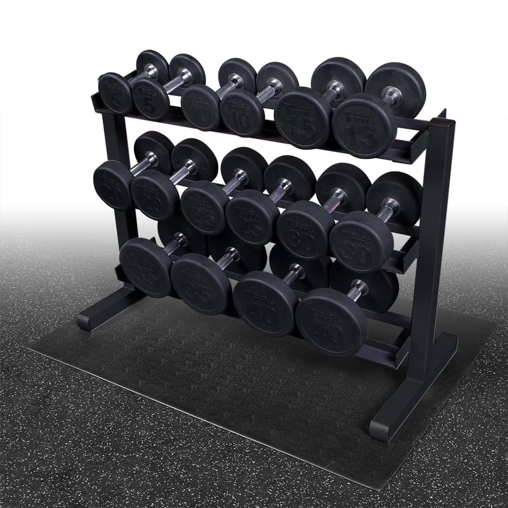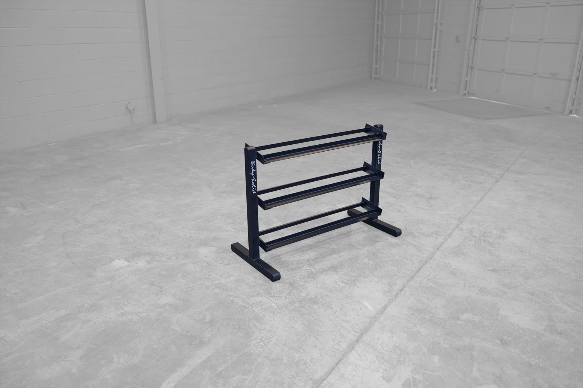 Die Body-Solid Kurzhantelablage eignet sich perfekt zur kompakten Aufbewahrung aller Kurzhantelarten, die ein Innenmaß bzw. eine Griffstücklänge von mehr als 11,5cm besitzen. Durch die angewinkelten Ablagebleche wird das Herausnehmen und Ablegen der Hanteln erleichtert und somit das Verletzungsrisiko deutlich gesenkt. Je nach Hantelgröße kann ein Ablageblech mit bis zu vier Hantelpaaren bestückt werden, so dass die Aufbewahrung von insgesamt 12 Kurzhantelpaaren möglich ist. Eine robuste 5 x 5cm Stahlrahmenkonstruktion sowie Ablageschienen aus vollmaterial gewährleisten eine sichere und vor allem extrem stabile Ordnungsmöglichkeit für Ihren Trainingsraum.