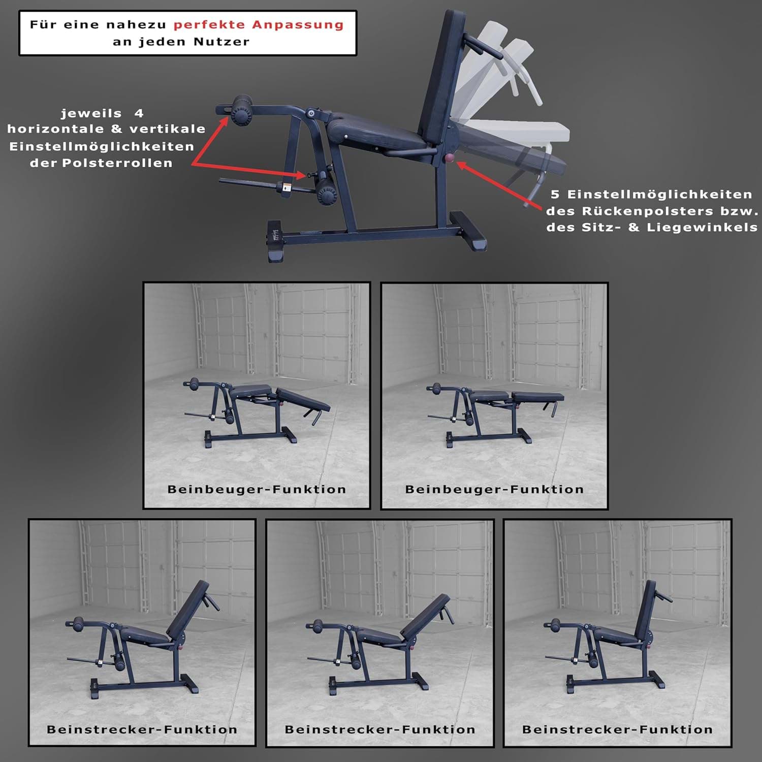 - Wechsel zwischen Beinstrecker- und Beinbeugerfunktion über die Verstellung der Rückenlehne