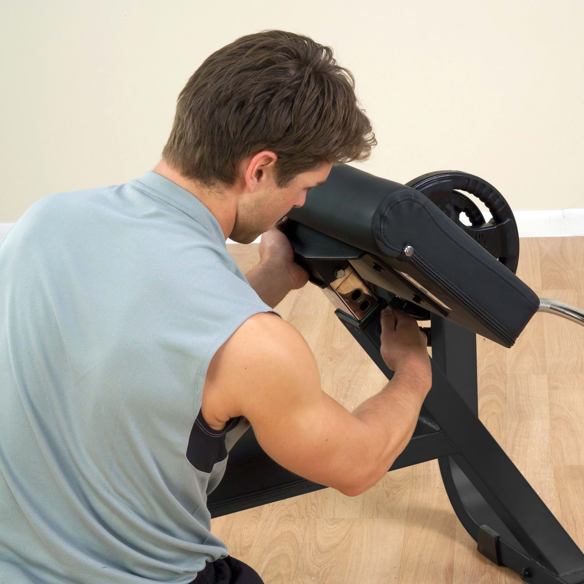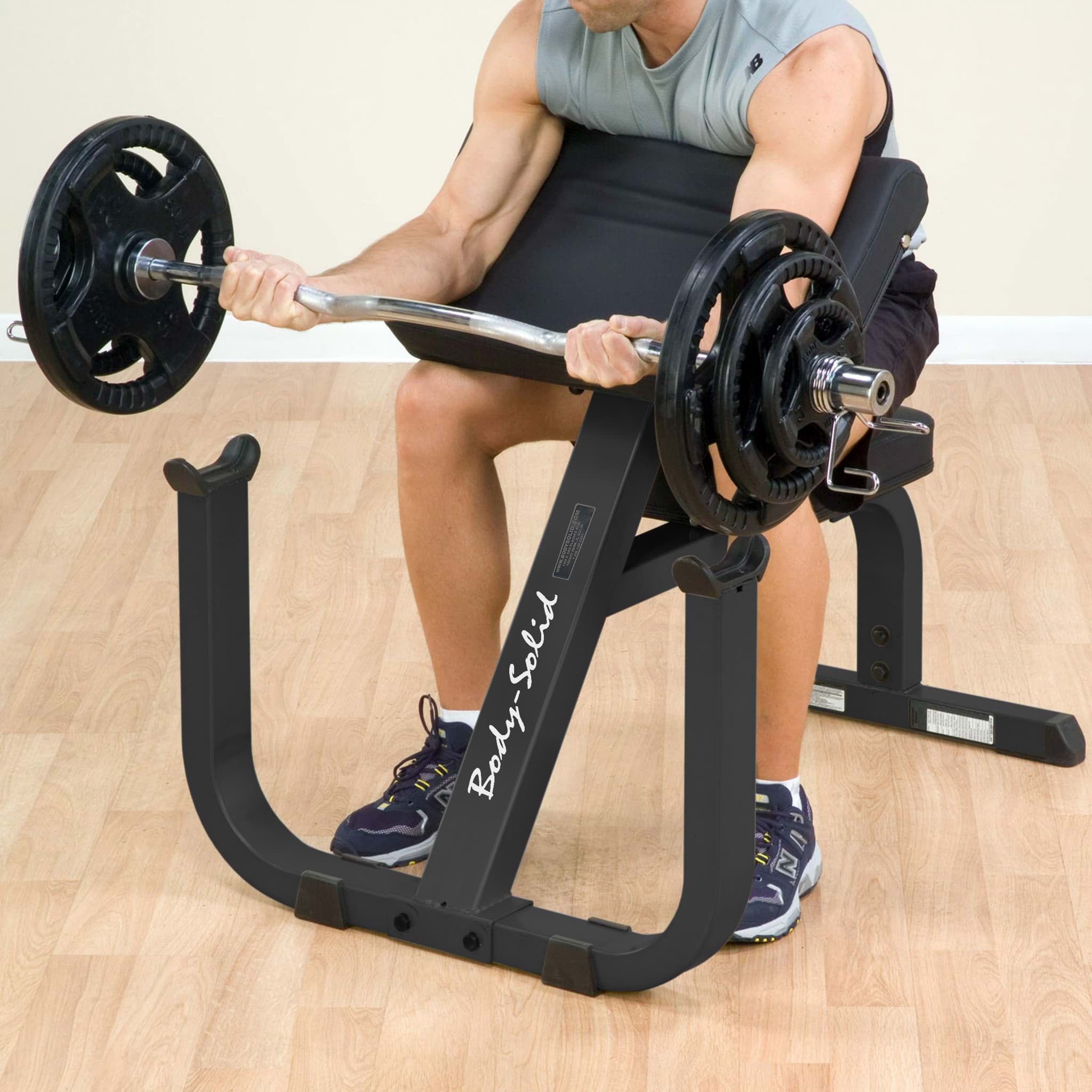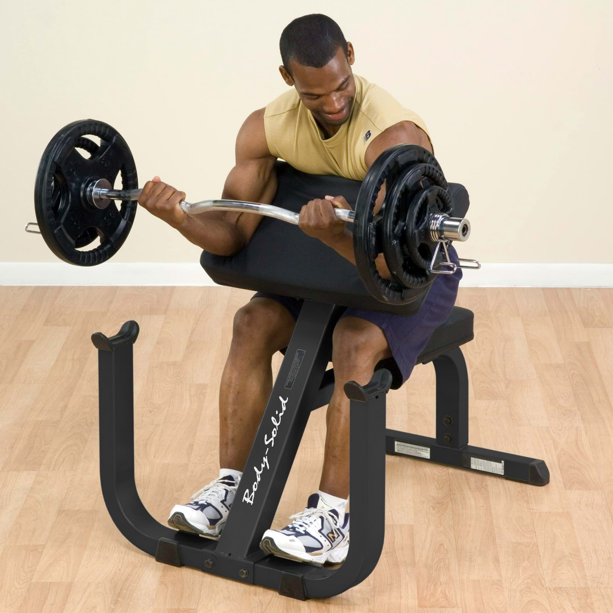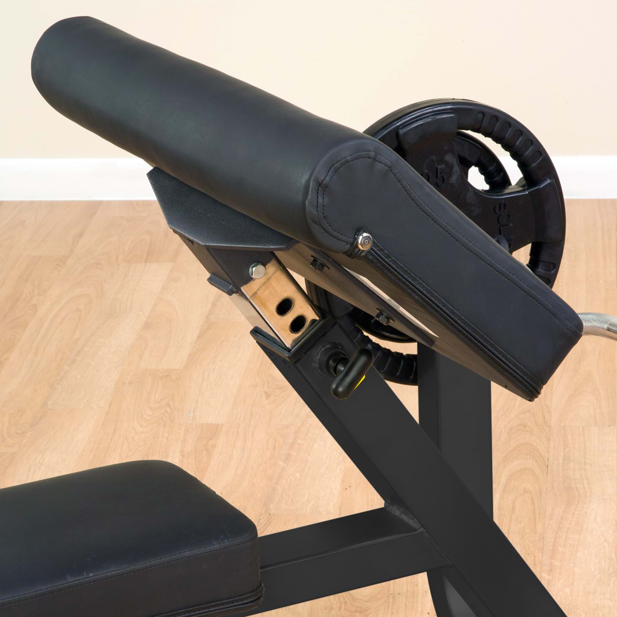 Wenn es darum geht, den Bizeps für eine maximale Kontraktion und Entwicklung zu isolieren, führt kein Weg an einer Curlbank vorbei. Preacher Curls sind ausschlaggebend für den Aufbau der gesamten Bizepsmasse, einschließlich des oft schwierigen unteren Bizeps. Die Body-Solid GPCB-329 Curlbank verfügt über ein 30° angewinkeltes Armpolster, wodurch der Oberarm maximal gestreckt und voll beweglich ist, ohne die Ellenbogen und den unteren Rücken zu belasten. Zudem kann das Armpolster per Pop-Pin 7-fach in der Höhe verstellt werden, um so eine korrekte Trainingsposition sicherzustellen. Die 77cm breite Hantelstangenablage erleichtert vor und nach der Trainingseinheit das Herausnehmen bzw. Ablegen des Trainingsgewichts. Extra starke, hochwertige DuraFirm-Polster mit reißfester Doppeltnaht sowie eine extrem stabile 5x7,5cm Stahlrahmenkonstruktion garantiert zudem ein angenehmes und vor allem stabiles Training.