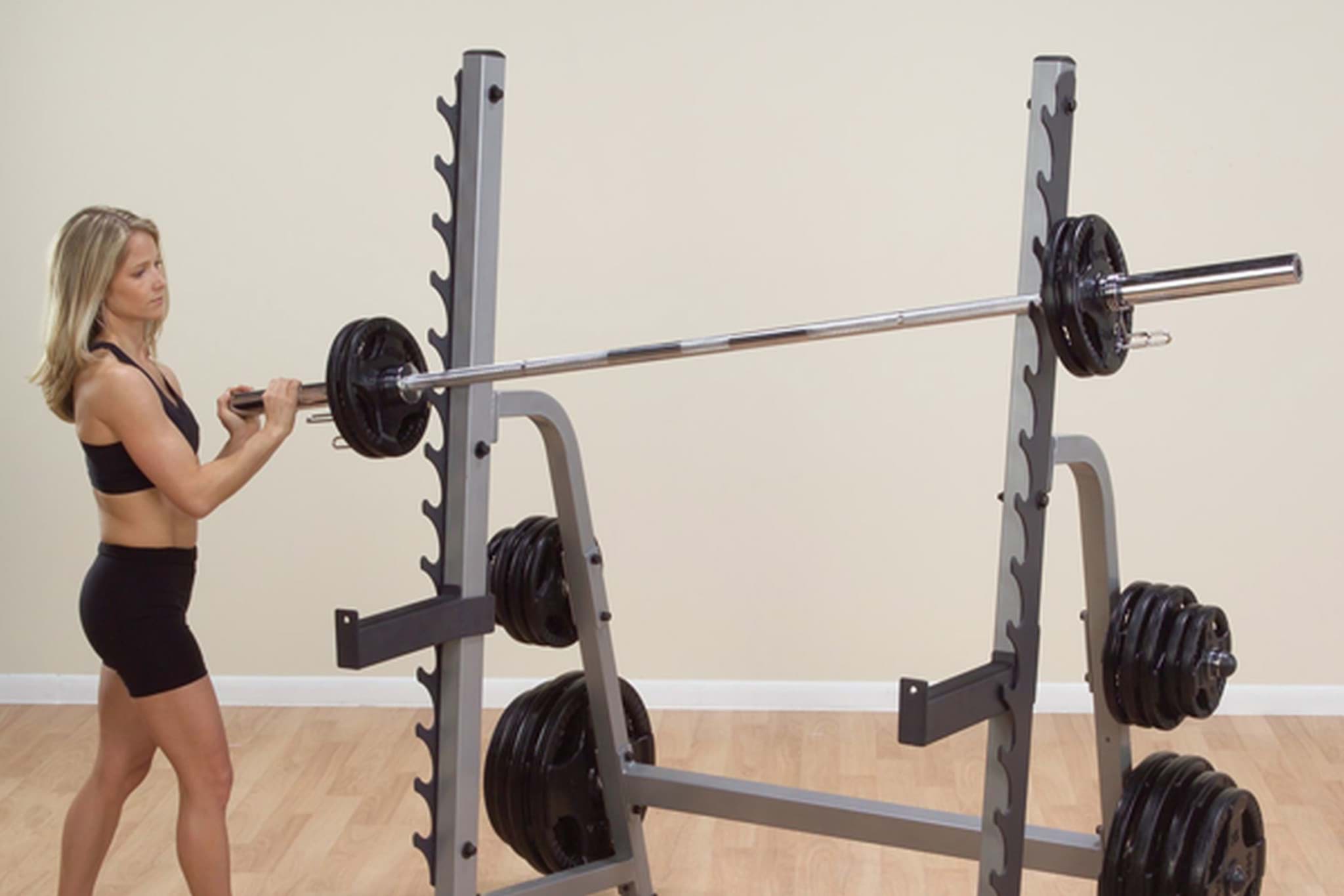 Wenn Sie mehr Masse und Kraft aufbauen und somit Ihre Leistung steigern möchten, ist das Multi-Press-Rack von Body-Solid definitiv die Grundlage dafür. Das Training mit freien Gewichten ist am effektivsten, wenn sich der Trainierende sicher genug fühlt, um schwere Gewichte zu verwenden, um so an seine Grenzen zu gehen. Aus diesem Grund verfügt das Body-Solid GPR-370 über einen extrabreiten 4-Punkt-Stand, 14 Ablagepositionen am Gun-Rack sowie 15 Einstellmöglichkeiten für beide Sicherheitsablagen. Dabei kann die Langhantel am Gun-Rack einseitig auf bzw. ab bewegt werden, sodass es zwischen den Übungen nicht mehr nötig ist, die Hantelscheiben zu entladen oder die Langhantel im Ganzen zu bewegen. Der Abstand vom der Außenkante des Gun-Racks zur anderen Seite beträgt 121cm, wodurch eine Langhantelstange mit einem Innenmaß von mindestens 130cm zu empfehlen ist. Um einen natürlichen Bewegungsablauf z.B. bei Kniebeugen, Wadenheben, Ausfallschritte, Kreuzheben etc. zu gewährleisten, ist das Multi-Press-Rack mit einer 7°-Umkehrneigung ausgestattet worden. In Kombination mit einer beliebigen Freihantelbank ist das Multi-Press-Rack auch optimal dazu geeignet Flach- und Schrägbankübungen, Nackendrücken, Schulterdrücken u.v.m. durchzuführen.