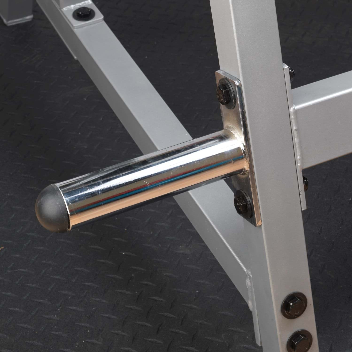 Wenn Sie mehr Masse und Kraft aufbauen und somit Ihre Leistung steigern möchten, ist das Multi-Press-Rack von Body-Solid definitiv die Grundlage dafür. Das Training mit freien Gewichten ist am effektivsten, wenn sich der Trainierende sicher genug fühlt, um schwere Gewichte zu verwenden, um so an seine Grenzen zu gehen. Aus diesem Grund verfügt das Body-Solid GPR-370 über einen extrabreiten 4-Punkt-Stand, 14 Ablagepositionen am Gun-Rack sowie 15 Einstellmöglichkeiten für beide Sicherheitsablagen. Dabei kann die Langhantel am Gun-Rack einseitig auf bzw. ab bewegt werden, sodass es zwischen den Übungen nicht mehr nötig ist, die Hantelscheiben zu entladen oder die Langhantel im Ganzen zu bewegen. Der Abstand vom der Außenkante des Gun-Racks zur anderen Seite beträgt 121cm, wodurch eine Langhantelstange mit einem Innenmaß von mindestens 130cm zu empfehlen ist. Um einen natürlichen Bewegungsablauf z.B. bei Kniebeugen, Wadenheben, Ausfallschritte, Kreuzheben etc. zu gewährleisten, ist das Multi-Press-Rack mit einer 7°-Umkehrneigung ausgestattet worden. In Kombination mit einer beliebigen Freihantelbank ist das Multi-Press-Rack auch optimal dazu geeignet Flach- und Schrägbankübungen, Nackendrücken, Schulterdrücken u.v.m. durchzuführen.